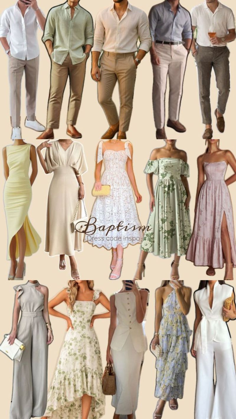Para elas: vestidos ou conjuntos leves, midi ou abaixo do joelho, cores suaves, florais delicados e tecidos elegantes. Evitar decotes muito profundos, fendas altas e transparências excessivas, por respeito ao ambiente religioso. Saltos baixos ou médios são super bem-vindos.